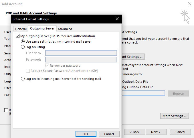Next, go to “more settings” and go to the “outgoing server “ tab at the top. Check the box that says “My outgoing server (SMTP) requires authentication.